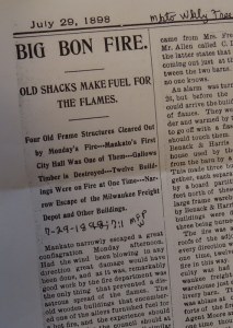 Mankato narrowly escaped a great conflagration Monday afternoon. Had the winds been blowing in any direction great damage would have been done, and it was, remarkably good work by the fire department was the only thing that prevented a disastrous spread of the flames. The old wooden buildings that encumbered one of the alleys furnished fuel for a hot fire, and the experience should not be lost, for the council should at once take steps to condemn all similar dangerous fire traps in the vicinity of business property….