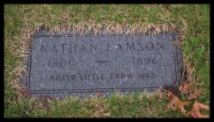 The grave marker for Mary Elizabeth’s father, Nathan Lamson in Champlain Cemetery, Champlain, MN. According to the inscription on this marker, Lamson’s sole claims to fame were that he lived to be 96 and that he “KILLED LITTLE CROW 1863.”