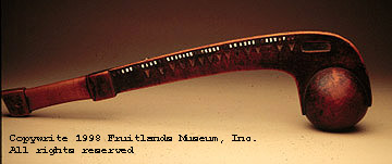 Rowlandson’s immediate captors were two native sachems, Quinnapin and one of his wives, Weetamoo, but she met the powerful King Philip (Metacomet) while she was a hostage, and he was responsible for allowing her to be ransomed for twenty pounds. The “war club” is presently housed at the Fruitlands Museum in Harvard, Massachusetts. [v] But Michael Volmer, the museum curator, admits “When and where the club, presently assumed to be Philip’s, came from is something of a mystery.” Although some oral and written provenance exists, all he can conclude is that in his “estimation the club was manufactured during the seventeenth century, in all likelihood by a Native American.”[vi]