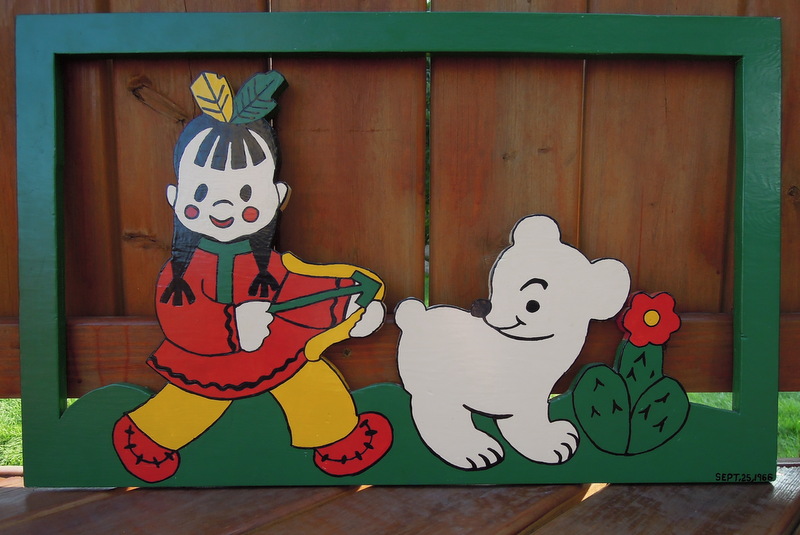My mom laughed. “I didn’t really paint the picture,” she said. “When your dad brought it up from the shop, it was already painted. But he had saved the details for me –the black lines. Like I couldn’t imagine a sinister hunting scene hanging over your crib. So I gave the Indian child and the bear smiles, like they are playing. But he was already a polar bear. I just made him a happy polar bear.”
