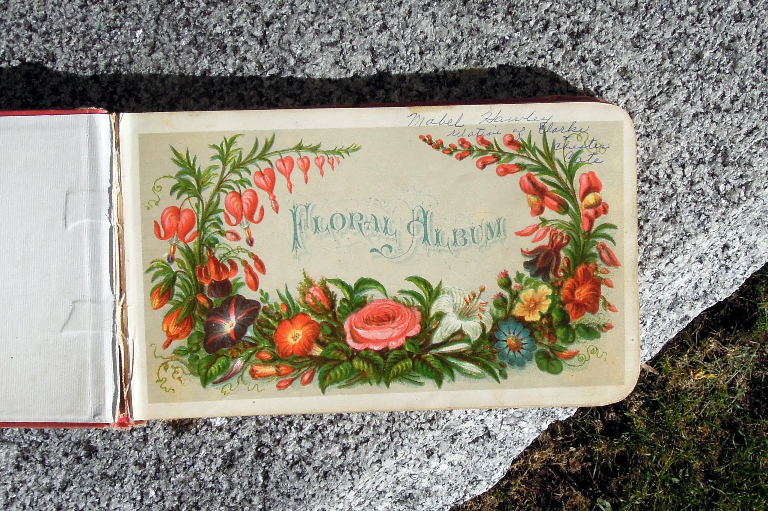 Vicki and I found Mabel’s grave at the end of a long, wonderful day exploring Poysippi, Berlin, and Ripon, the places Mabel Hawley and Ella Renville called home in Wisconsin. Then we found a handy ledge on a nearby mausoleum and opened Mabel’s autograph album again.