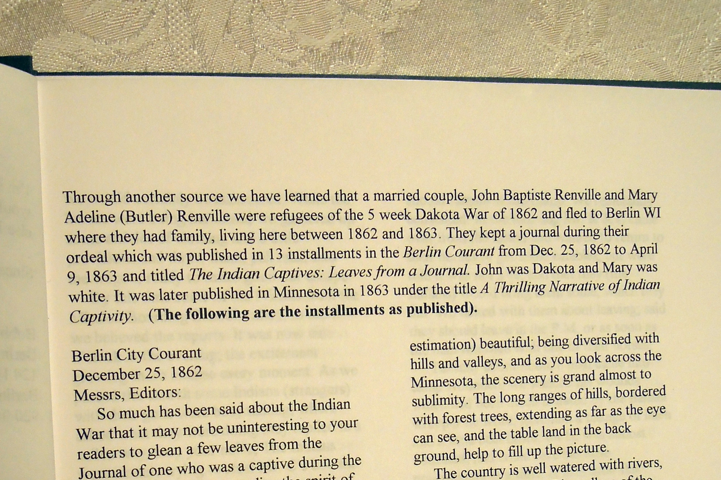There Mary sat down at a table and, with Ella and Belle playing at her feet, opened a journal she had kept during the war and began writing the newspaper serial for the Berlin City Courant, that became, in 1863, A Thrilling Narrative of Indian Captivity.