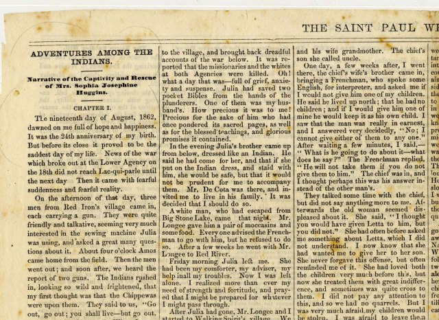“Adventures Among the Indians: Narrative of the Captivity and Rescue of Mrs. Sophia Josephine Huggins,” as reprinted in the St. Paul Weekly Press February 12, 1863, page 3.