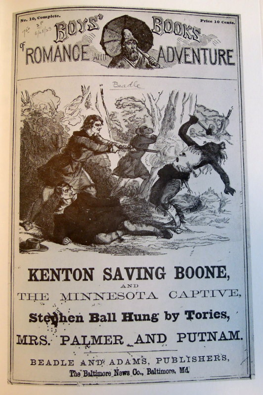Cover (facsimile) of Beadle and Adams Boys Books of Romance and Adventure, No. 10 containing “The Minnesota Captive,” 1864, as reproduced in the Garland Library of Narratives of North American Indian Captivities, vol. 86, 1978.