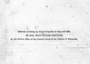 A statehood centennial investigation by the Minnesota Historical Society discovered A Thrilling Narrative was the first book copyrighted in Minnesota by a woman living in the state, entered in the Clerk’s Office of the District Court of the District of Minnesota in July 1863.
