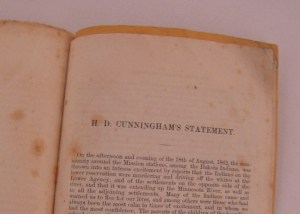 The MHS copy is one of only three to have Hugh Cunningham’s story bound in at the back. The photo above shows that Cunningham’s Statement, which was printed and trimmed separately, then incorporated into the book at binding.